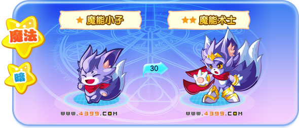 | 成长故事:魔能小子的眼睛本来不是这么小的,但是由于它太喜欢笑,如今已成眯眯眼了。 | 成长故事:魔能术士非常聪明,看过一次的魔法就能够轻松掌握,它的梦想是成为一名顶尖的术士。 | |||||||||||||||||||||||||||||||||||||||||||||