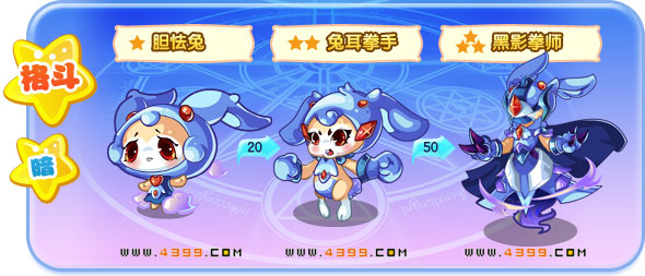 | 成长故事:胆怯兔害怕一切声音,只要有动静,它都会立马躲到岩石后面。 | 成长故事:兔耳拳手看上去很厉害的样子,其实它的胆子仍然很小,一听到打雷就要躲在被窝里。 | 成长故事:黑影拳师经过多年的训练,现在已经不会再害怕什么了,它已然成为一代强者。 | |||||||||||||||||||||||||||||||||||||||||||||||||||