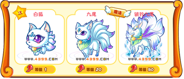 | 成长故事:一个从大雪纷飞的夜晚走出来的灵兽,没有人知道它来自哪里,它的未来和它的出现一样充满传奇。 | 成长故事:它所到之处充满祥瑞,繁花盛开,绿树成荫,为了躲避人们的崇拜的跟踪,它选择隐藏在雪山之中。 | 成长故事:长大后的它,才发现自己就是传说中的九尾狐,留在这里,守护好自己成长雪山是它最大愿望。 | |||||||||||||||||||||||||||||||||||||||||||||||||||