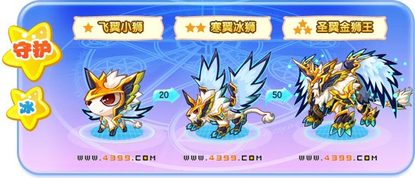| 成长故事:飞翼小狮从小就是一副飞天小将的派头,走到哪里都是精神抖擞、威风凛凛的。 | 成长故事:寒翼冰狮是实力与帅气的完美结合体,无论是外型还是能力都是人们热衷于讨论的话题。 | 成长故事:圣翼金狮王全身散发出一种让人望而生敬的勇士气息,俨然一副王者的风范。 | |||||||||||||||||||||||||||||||||||||||||||||||||||