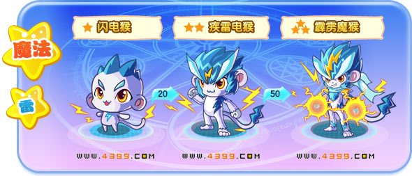 | 成长故事:闪电猴身上的闪电只有在战斗时才会造成伤害,平时碰触起来可是暖暖的,就像阳光一样。 | 成长故事:疾雷电猴可以把闪电变成各种形状,每当举办晚会时,它都会把闪电做成各种炫丽的装饰布置现场。 | 成长故事:霹雳魔猴对闪电的控制越来越随心所欲了,双手环绕的电环似乎在宣告着它对自身能力的骄傲。 | |||||||||||||||||||||||||||||||||||||||||||||||||||