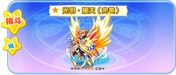 神光圣环:掌控世界神光,形成能无视敌人闪避进行攻击的圣环,随机攻击敌方1只灵兽,造成伤害的同时有较高几率令对手昏迷。 光明审判:聚拢神力,代表光明发起审判,无视敌人闪避进行攻击,造成2倍伤害,对守护特长的灵兽造成3倍伤害,造成的部分伤害会转化成自身血量,同时提升自身三攻三防,持续2回合。