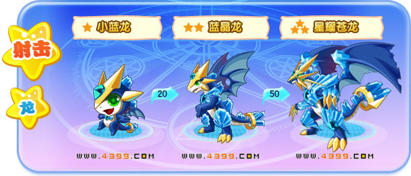 | 成长故事:小蓝龙生性好玩,每天都在逆龙隧道中四处游荡,自己玩得不亦乐乎! | 成长故事:蓝晶龙有很大的野心,想要征服逆龙隧道,但是现在实力不够,它便开始潜心修炼! | 成长故事:经过了长时间的苦练,星耀苍龙掌握了射击的精髓,能够在远处击退那些擅闯逆龙隧道的家伙! | |||||||||||||||||||||||||||||||||||||||||||||||||||