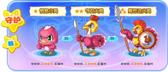 | 成长故事:孤傲的性格,暴躁的脾气,使愤怒小鸡一直生活在被孤立的环境中,可它却十分向往热闹的生活环境。 | 成长故事:事实证明暴躁的脾气也是可以改变的,守卫火鸡成功改掉了坏脾气,并通过努力成为了一名正义的守卫。 | 成长故事:斯巴达火鸡总是能让人出乎意料,它不但是一名严肃的守卫,同时它还是游戏乐园中一名杂技演员。 | |||||||||||||||||||||||||||||||||||||||||||||||||||