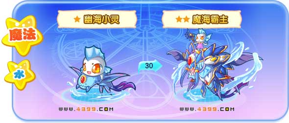 | 成长故事:幽海小灵出生在深暗的海底,可是自从有一次无意中看到陆地后,就常常偷偷地跑上陆地来玩。 | 成长故事:在游历完奥兹国后,魔海霸主觉得神圣之谷战场才是最适合它的地方,所以它决定从此长居于此了。 | ||||||||||||||||||||||||||||||||||||||||||
