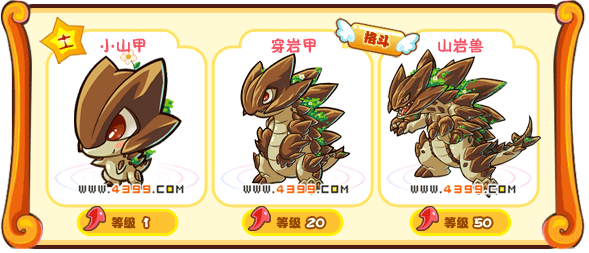 | 成长故事:它可以蹲下来伪装成一块石头,也可以在迅速钻入地下藏起来,很少有人能发现它。 | 成长故事:在坚硬的岩石之间穿梭,就想在陆地上跑步一样,轻松自如,因为它有撕裂岩石的力量。 | 成长故事:岩石般的身体,撕裂岩石的爪子,还有可以横扫一切障碍物的强有力的尾巴,震撼无比。 | |||||||||||||||||||||||||||||||||||||||||||||||||||