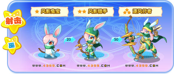 | 成长故事:风影兔宝听前辈说过,在很远的一个地方藏着一把神奇的弓箭,它便开始踏上了寻宝的旅程! | 成长故事:风影猎手踏遍了千山万水,终于找到了那把弓箭,接着便开始了箭术的艰苦训练。 | 成长故事:逐风行者的箭术终于达到很高的境界,但是它并不满足于此,它开始四处游历,寻找新的突破。 | |||||||||||||||||||||||||||||||||||||||||||||||||||