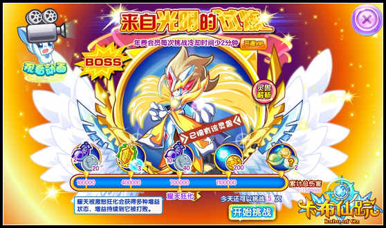 1、在活动【来自光明的试炼】中,对耀天造成150W的累计伤害,就可以领取耀天灵兽蛋~