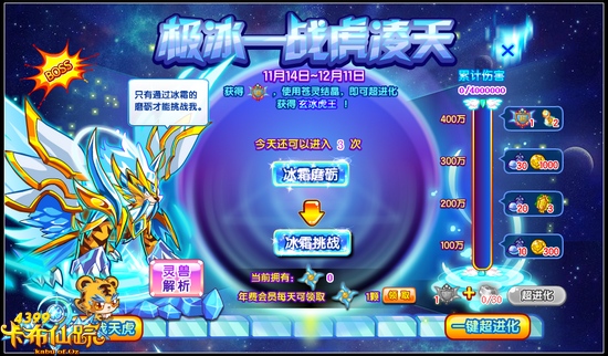 在活动《极冰——战虎凌天》中,累计对玄冰虎王造成400W的伤害就可以获得超进化勋章;使用1个超进化勋章和30个苍灵结晶可以使战天虎超进化成为玄冰虎王!