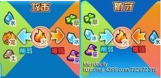 火系攻击对草、冰、巫属性的灵兽是增强效果,对水、龙、土属性的灵兽是削弱效果。