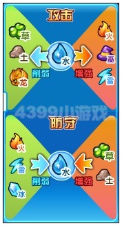 水系攻击对火、巫、雷属性的灵兽是增强效果,对草、土、龙属性的灵兽是削弱效果。