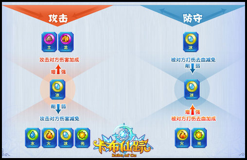 火系与光系攻击己方增强,冰系攻击己方削弱。