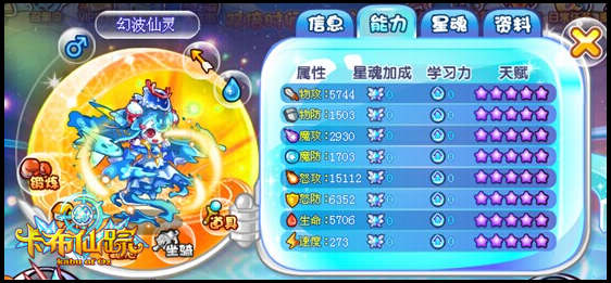 卡布仙踪幻波仙灵水系第一强宠,美丽可爱,外貌协会强力推荐。三防和物攻都不错,怒攻暂居全灵兽第一位,生命很脆,建议加星魂和学习力。