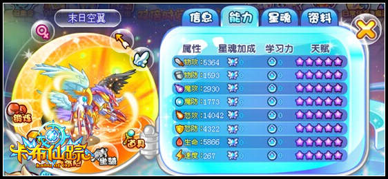 怒攻:14042,虽然低于一部分灵兽但是这超强的怒攻加上他的暴击率和大招完全可以弥补他和其他灵兽的不足。