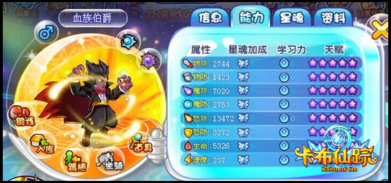 卡布仙踪血族伯爵满战斗力为3780,外表略丑,三防、速度、生命极低,魔攻、怒攻还可以。