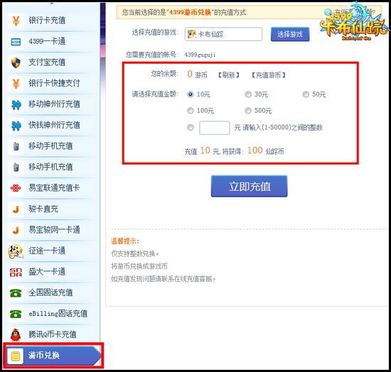 1游币=10仙踪币,到这里我们要进入充值中心选择游币兑换,把游币兑换成4399卡布仙踪的仙踪币!