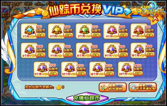 兑换仙踪币之后,可以到4399卡布仙踪游戏中兑换免费VIP啦!点击进入游戏之后点击左下角的VIP按钮就可以进入VIP界面啦!然后选择兑换VIP就可以兑换免费VIP了哦!