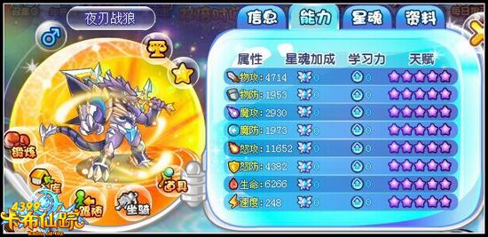 卡布仙踪夜刃战狼的四防不算高,推荐多刷刷。物攻和暴击要多加,星魂、学习力方面要做到十全十美。